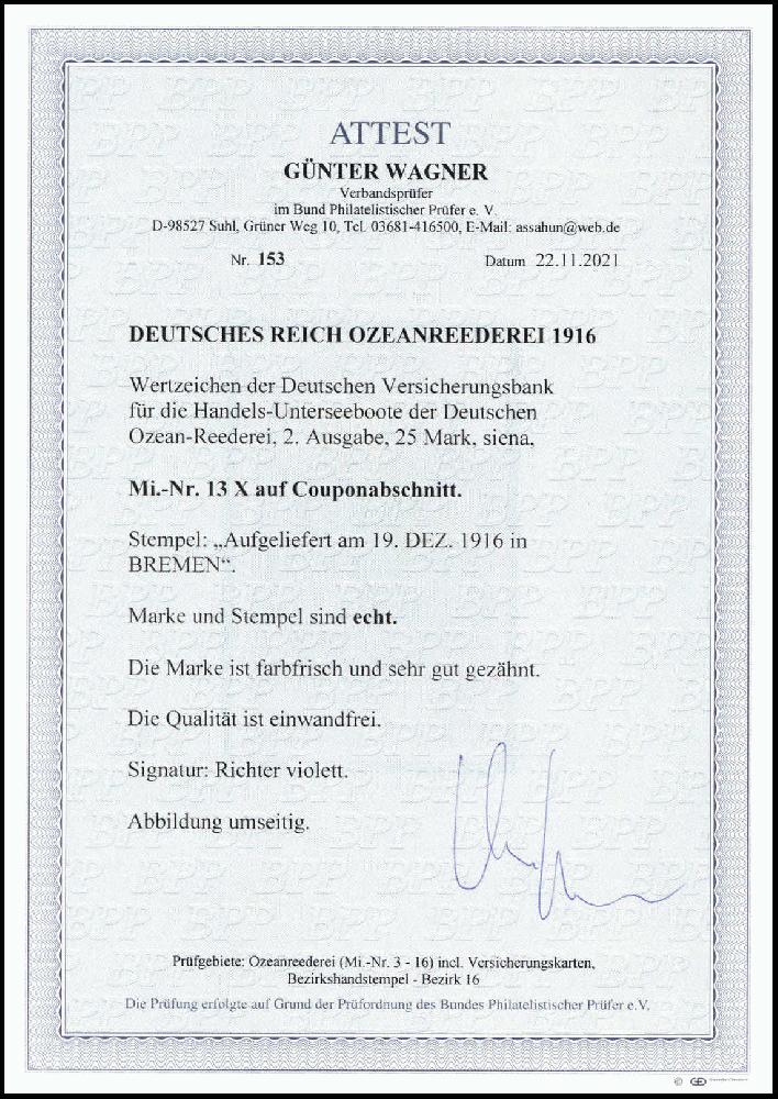 | Prüfgebiet: | Deutsches Reich Schiffspost im Ausland Ozeanreederei 1916/17 |