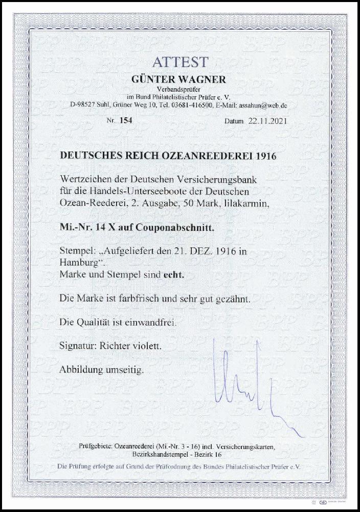 | Prüfgebiet: | Deutsches Reich Schiffspost im Ausland Ozeanreederei 1916/17 |