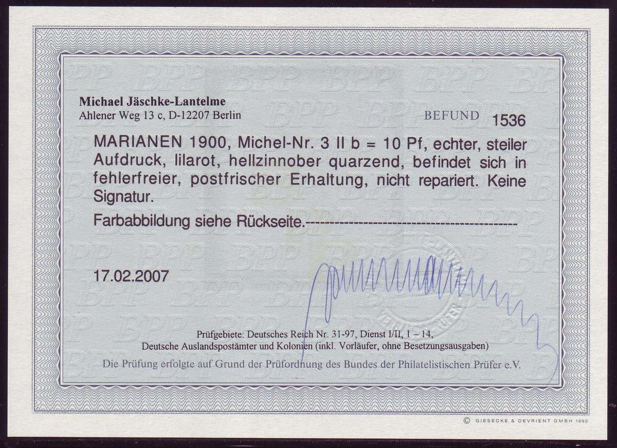 | Zusatzinformationen und Suchstichworte: | Christian E. Geigle Briefmarkenfachhandel Los 0000305793 Deutsche Kolonien Marianen 1900, Freimarken mit steilem Aufdruck "Marianen", 10 Pf. lilarot, postfrisches Luxusstück dieser guten Farbe, unsigniert mit FB Jäschke-Lantelme "fehlerfrei". Festpreis 175,00 EUR |