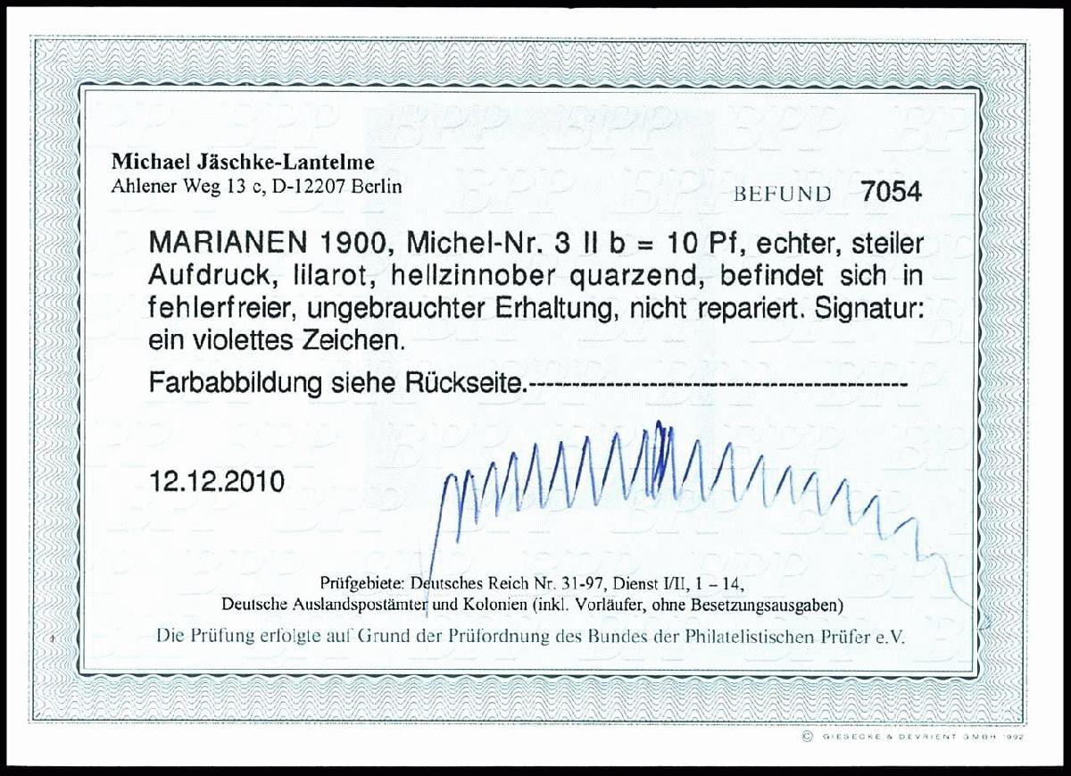 | Zusatzinformationen und Suchstichworte: | Dr. Reinhard Fischer 186. Auktion Auktionstermin: 18. - 21. Mai 2022 Los 2666 Deutsche Kolonien Marianen 10 Pf lilarot (UV hellzinnober) tadellos ungebraucht, Fotobefund Jäschke-Lantelme BPP: "in fehlerfreier, ungebrauchter Erhaltung." Mi. 200.- Ausruf 50,00 |
