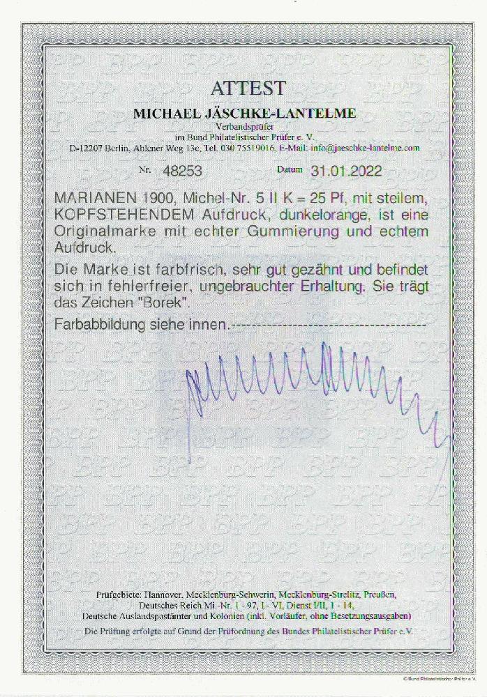| Zusatzinformationen und Suchstichworte: | 228. Karl Pfankuch & Co Auktion Auktionstermin: 6. - 7. April 2022 Los 1912 Deutsche Kolonien Marianen 25 Pf dunkelorange, mit steilem kopfstehendem Aufdruck, sauber ungebraucht mit Originalgummierung, farbfrisch, sehr gut gezähnt in fehlerfreiere Erhaltung, sign. Borek und aktuelles Fotoattest Jäschke-Lantelme, Kabinett. Selten! M€ 2.800.- Zuschlag 750,00 EUR |