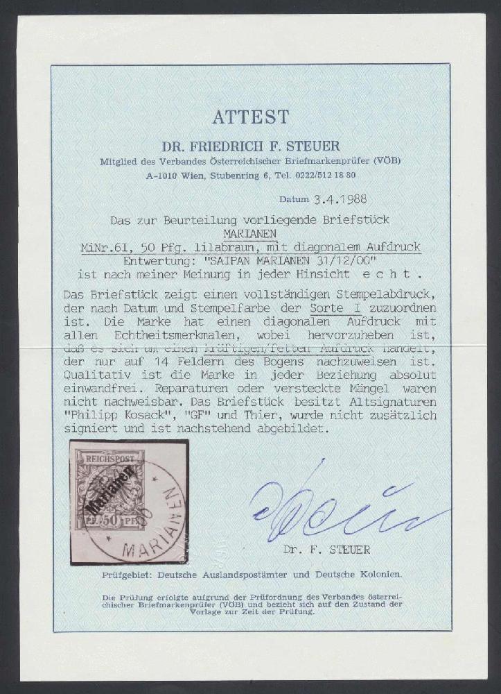 | Zusatzinformationen und Suchstichworte: | Auktionshaus Weiser 770. Auktion Auktionstermin: 1. - 2. Juli 2022 Los 1038 Deutsche Kolonien Marianen Deutsche Kolonien / Marianen 1899, Diagonaler Aufdruck, 50 Pfg. rötlichbraun, mit Stempel 'SAIPAN 31/12/00', auf LUXUS-Briefstück, laut Attest handelt es sich um eine Aufdruck-Variante, die nur auf 14 Feldern des Bogens nachzuweisen ist, Kolonien-RARITÄT, Altsignaturen Kosack und Thier, Foto-Attest Steuer BPP (Bfst., Mi.-Nr. 6 I , Mi.EUR 3.000,--+) (2002) Ausruf 800,00 EUR |