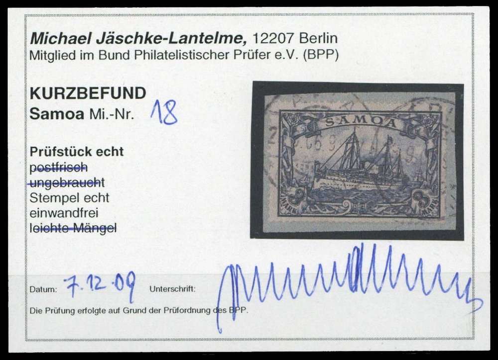 | Zusatzinformationen und Suchstichworte: | DBA Freiburg GmbH Los 1730010329 Deutsche Kolonien Samoa 1900, 3 Mark Kaiseryacht ohne Wasserzeichen auf Briefstückchen, Farb- Kurzbefund Jäschke L. BPP "echt und einwandfrei" (ME 170.-) Festpreis 80,00 EUR |