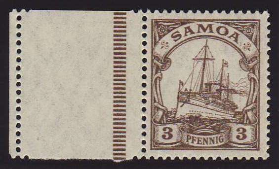 | Zusatzinformationen und Suchstichworte: | Christian E. Geigle Briefmarkenfachhandel Los 0003335135 Deutsche Kolonien Samoa 1919, Schiffszeichnung mit Wasserzeichen, 3 Pf. orangebraun, postfrisches Luxusstück mit links anhängendem Leerfeld, perfekt gezähnt, nicht häufig, unsigniert mit FKB Steuer "einwandfrei". Festpreis 99,00 EUR |