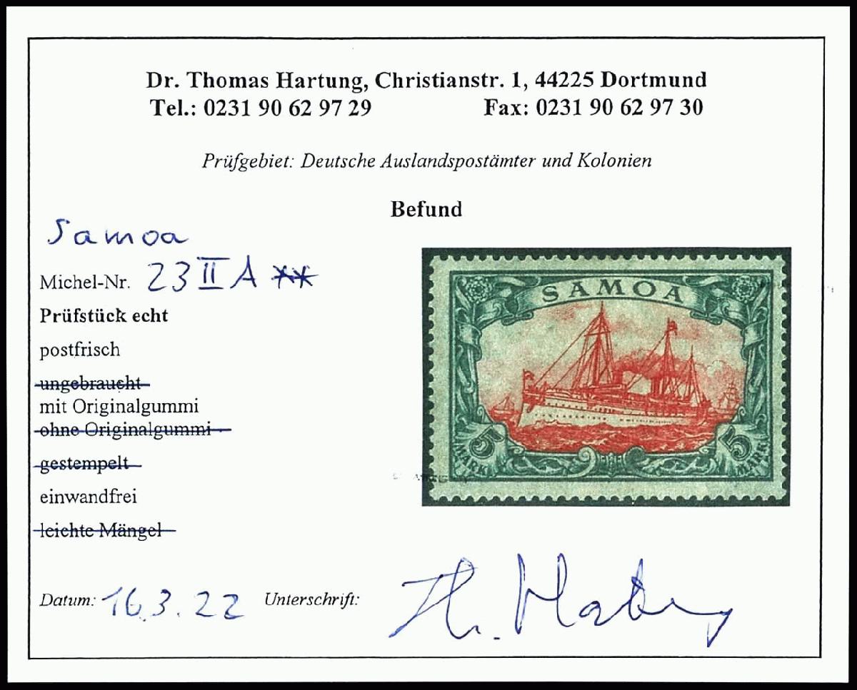 | Zusatzinformationen und Suchstichworte: | Dr. Reinhard Fischer 186. Auktion Auktionstermin: 18. - 21. Mai 2022 Los 2702 Deutsche Kolonien Samoa 5 Mark Kriegsdruck gezähnt 26:17 tadellos postfrisch, Fotobefund Dr. Hartung: "postfrisch, einwandfrei", Mi. 200,- Ausruf 70,00 EUR |