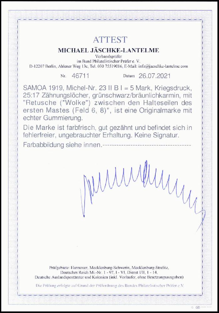 | Zusatzinformationen und Suchstichworte: | Württembergisches Auktionshaus 140. Versteigerung Auktionstermin: 18. Juni 2022 Los 7690 Deutsche Kolonien Samoa 5 Mk., Kriegsdruck, Zähnung B, mit Plattenfehler I ("Wolke" (Retusche) zwischen den Halteseilen des vorderen Mastes), tadellos ungebr. Exemplar in perfekter Zähnung und Zentrierung. Eine äußerst seltene Marke, von der u.W. bisher erst drei Exemplare bekannt wurden, Fotoattest Jäschke-L.BPP. Ausruf 1.700,00 EUR |