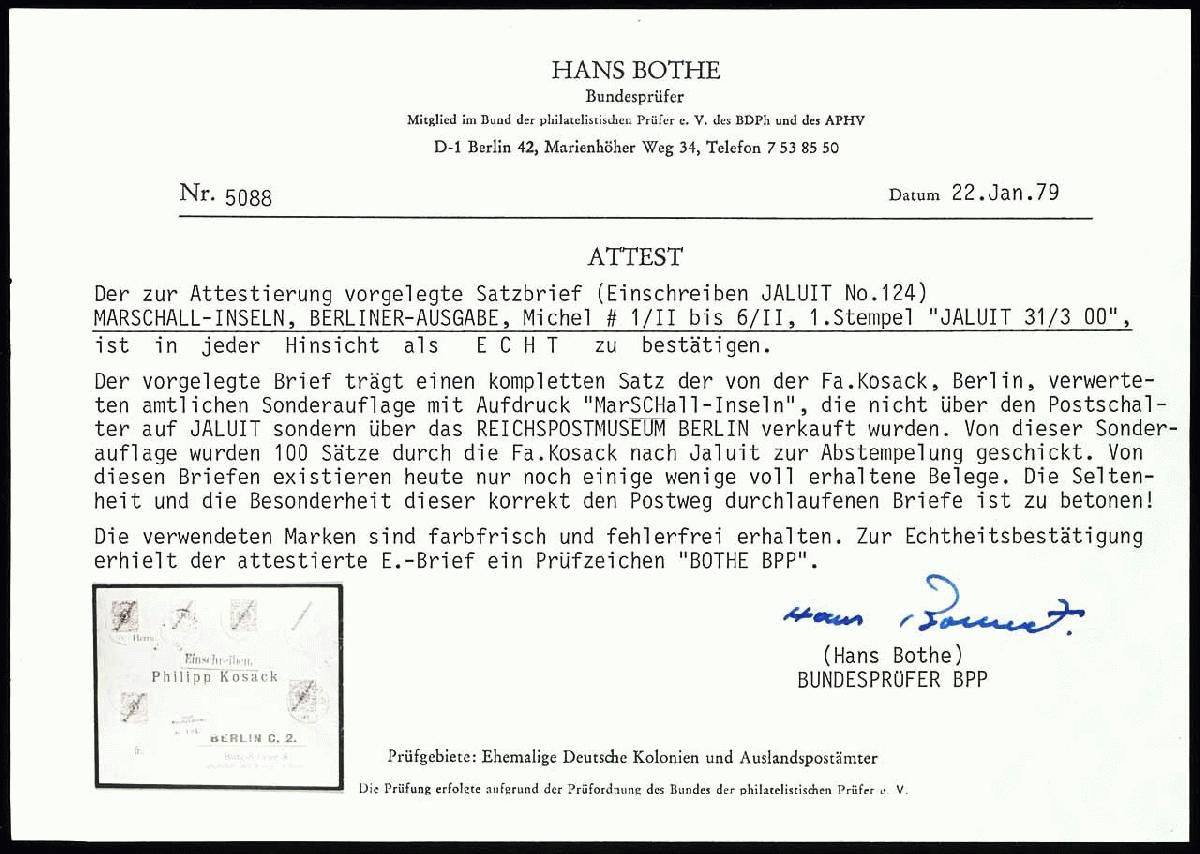 | Zusatzinformationen und Suchstichworte: | Dr. Reinhard Fischer 186. Auktion Auktionstermin: 18. - 21. Mai 2022 Los 2677 Deutsche Kolonien Marshall Inseln3 Pfg - 50 Pfg Berliner Ausgabe, kompletter Satz mit sechs Werten, gestempelt "JALUIT MARSCHALL-INSELN 31.3.00" auf R-Brief nach Berlin mit Ankunftsstempel, seltener Beleg aus der Kosack-Korrespondenz, von denen nur noch wenige erhalten sind - die meisten wurden für einzelne Briefstücke zerschnitten, um die Sammler zu versorgen, Fotoattest Bothe BPP - ein dekoratives Schaustück der Kolonial-Philatelie! Ausruf 2.500,00 EUR |