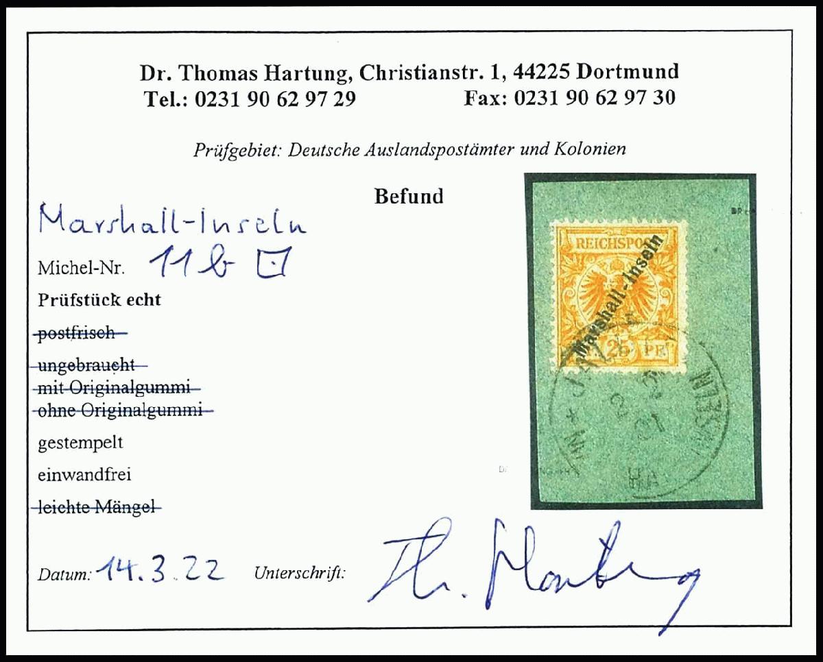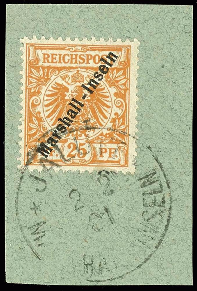 | Zusatzinformationen und Suchstichworte: | Dr. Reinhard Fischer 186. Auktion Auktionstermin: 18. - 21. Mai 2022 Los 2685 Deutsche Kolonien Marshall Inseln 25 Pf dunkelorange tadellos auf Briefstück, Fotobefund Dr. Hartung: "einwandfrei", Mi. 70,-- Ausruf 25,00 EUR |