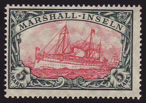| Zusatzinformationen und Suchstichworte: | Christian E. Geigle Briefmarkenfachhandel Los 0003335131 Deutsche Kolonien Marshall Inseln 1916/19, Schiffszeichnung mit Wasserzeichen, 5 M. grünschwarz/dunkelkarmin, Kriegsdruck, Zähnung A, Rahmen Type I, Mittelstück Type II, postfrisches Kabinettstück mit minimalem, herstellungsbedingtem Gummibug, unsigniert mit FKB Jäschke-Lantelme "einwandfrei" Festpreis 99,00 EUR |