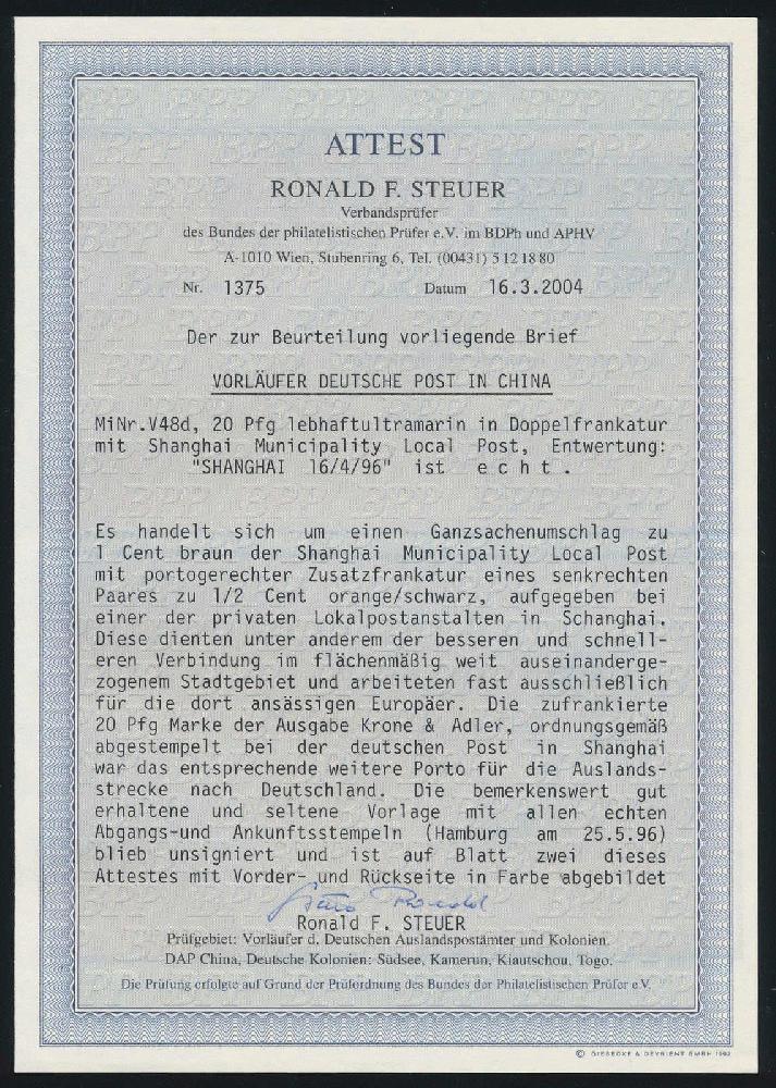| Prüfgebiet: | Deutsche Auslandspostämter China |