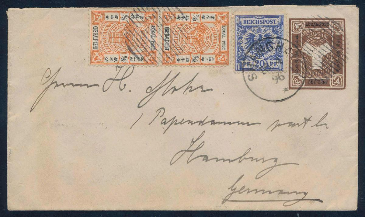 | Zusatzinformationen und Suchstichworte: | 79. HBA Auktion Auktionstermin: 12. - 14. Mai 2022 Los 1248 Deutsche Auslandspost China, Doppelfrankaturen 1896, Ganzsachen-Umschlag der Shanghai Municipality Local Post zu 1 C., mit portogerechter Zusatzfrankatur Paar 1/2 C., orange/schwarz (MiNr. 117), entwertet mit schwarzem Strichstempel und rückseitig Aufgabestempel der Local Post vom 16.IV.96 (Monatsangabe kopfstehend), mit bedarfsmäßiger Doppelfrankatur Krone/Adler 20 Pfg., ultramarin, entwertet "SHANGHAI 16 4 96", adressiert nach Hamburg mit Ankunftsstempel. Das innerchin. Porto für das Stadtgebiet von Shanghai wurde durch den Umschlag und die Zusatzfrankatur bezahlt, die deutsche Marke bezahlte das Briefporto nach Deutschland. Sehr saubere Prachterhaltung, sehr seltener Bedarfsbrief, gepr. Ronald Steuer mit Fotoattest. Zuschlag 2.300,00 EUR https://www.philasearch.com/de/i_9201_39552/10149010_Deutsche_Auslandspost_China_Doppelfrankaturen_Ganzsachen/9201-A79-1248.html?set_sprache=de&treeparent=COSUBGRP-10040%2CCO-10149010&postype=PH&indexTableId=0&breadcrumbId=1655284038.9932&row_nr=23 |