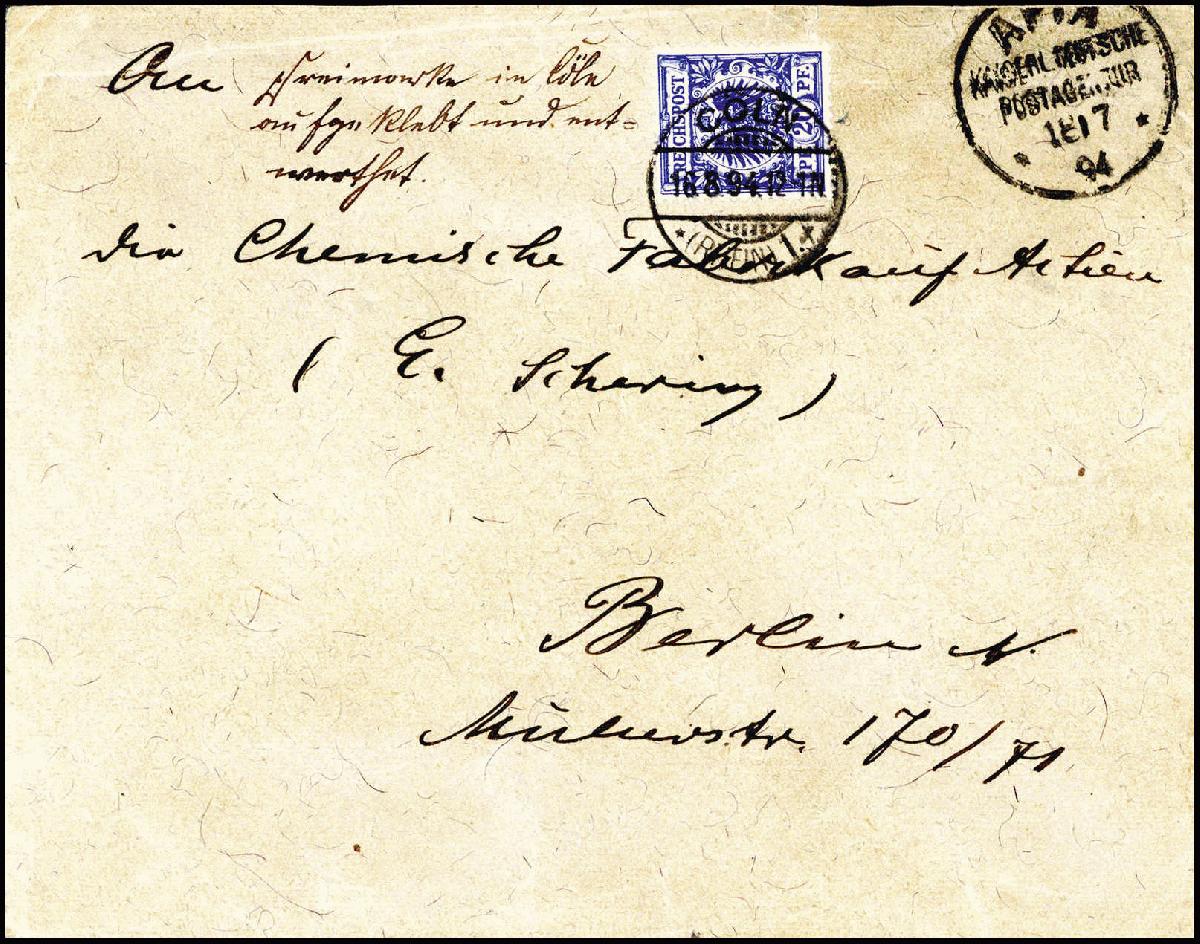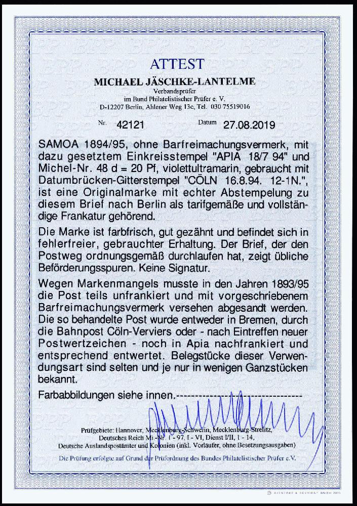 | Zusatzinformationen und Suchstichworte: | Württembergisches Auktionshaus 140. Versteigerung Auktionstermin: 18. Juni 2022 Los 7668 + Deutsche Kolonien Samoa, Vorläufer Barfrankierung Juli/August 1894: APIA KDPA 18/7 94, klar auf barfrankiert weitergeleitetem Brief nach Berlin. Beim Durchgangs-Postamt in Köln ordnungsgemäß nachfrankiert mit Krone/Adler 20 Pfg. und klarem Stempel CÖLN 18/8 94, daneben hs. Postvermerk "Freimarke in Cöln aufgeklebt und entwertet". Die Barfrankierungszeit Juli/August 1894 ist die seltenste von allen in Samoa vorgekommenen Notmaßnahmen wegen Markenmangels. Lt. Handbuch Dr.Steuer sind lediglich die beiden Daten vom 18.Juli und 9.August 1894 bekannt. Der hier angebotene Brief ist im Handbuch Dr. Steuer abgebildet (S.418). Eine ganz große Vorläufer-Rarität, Fotoattest Jäschke-L.BPP. Ausruf 6.000,00 EUR |