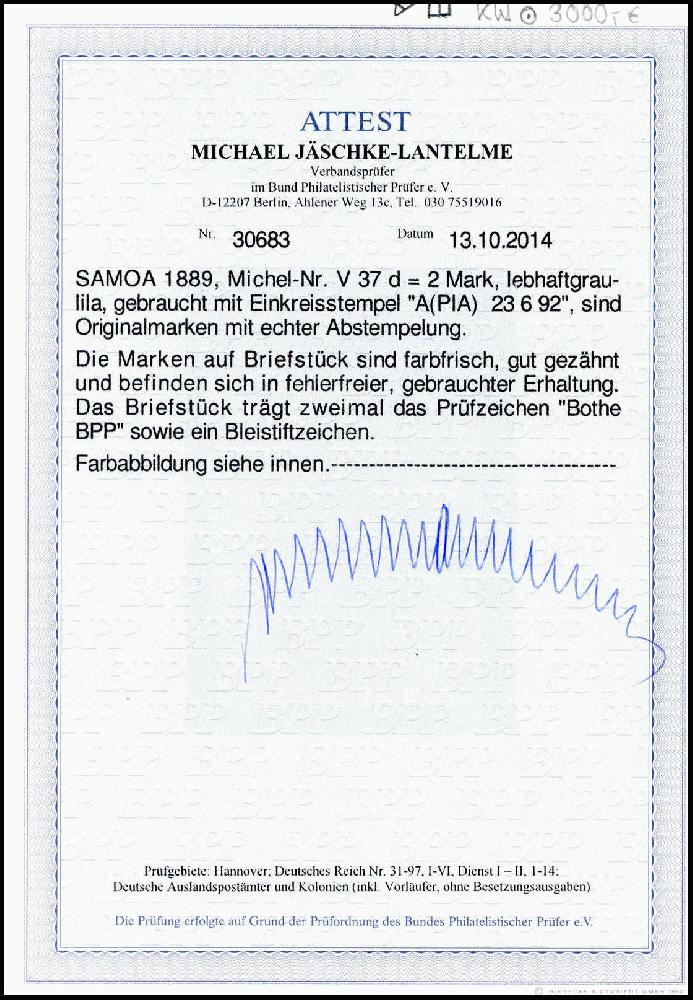 | Zusatzinformationen und Suchstichworte: | Württembergisches Auktionshaus 140. Versteigerung Auktionstermin: 18. Juni 2022 Los 7647 Deutsche Kolonien Samoa, Vorläufer 2 Mk. lebhaftgraulila, zwei tadellose Exemplare auf sauberem Leinen-Briefstück mit Stempel APIA KDPA 23/6 92. Selten, Fotoattest Jäschke-L.BPP. Katalogpreis: 3.000,- Ausruf 500,00 EUR |