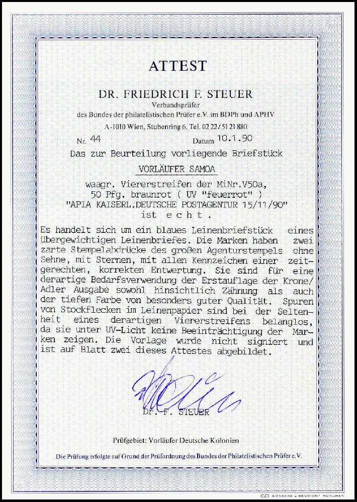 | Zusatzinformationen und Suchstichworte: | Württembergisches Auktionshaus 140. Versteigerung Auktionstermin: 18. Juni 2022 Los 7662 Deutsche Kolonien Samoa, Vorläufer 50 Pfg. bräunlichrot, tadelloser, waagr. Viererstreifen auf blauem Leinen-Briefstück mit zwei sauber aufges. Stempeln APIA KDPA 15/11 90. Eine sehr seltene Einheit der Erstauflage der 50 Pfg. in Samoa verwendet, Fotoattest Dr.Steuer BPP ("Von besonders guter Qualität"). Katalogpreis: 2.400,- Ausruf 500,00 EUR |
