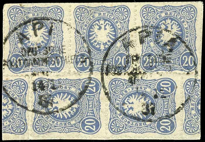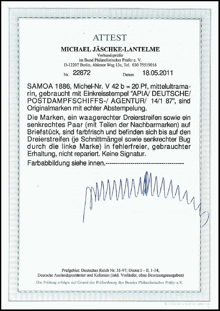 | Zusatzinformationen und Suchstichworte: | Dr. Reinhard Fischer 186. Auktion Auktionstermin: 18. - 21. Mai 2022 Los 2692 Deutsche Kolonien Samoa, Vorläufer 20 Pfennig mittelultramarin, fünf Werte (Dreierstreifen und senkr. Paar) auf Briefstück mit Entwertung "APIA / Deutsche / Postdampfschiffs / Agentur / 14.1.87", Schnittmängel sowie senkrechter Bug durch den Dreierstreifen, sonst tadellos, Fotoattest Jäschke-Lantelme BPP (2011), Mi. 1.000.- Zuschlag 150,00 EUR |