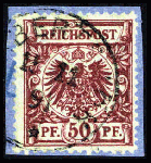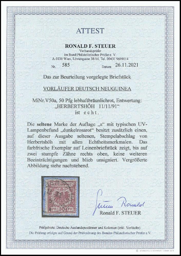 | Zusatzinformationen und Suchstichworte: | Württembergisches Auktionshaus 140. Versteigerung Auktionstermin: 18. Juni 2022 Los 5979 Deutsche Kolonien Neuguinea, Vorläufer 50 Pfg. lebhaftbräunlichrot, erstklassig farbfrisches Exemplar auf blauem Briefstück (re. oben zwei stumpfe Zähnchen) mit fast zentr. Stempel HERBERTSHÖH 11/11 91. Eine ganz große Vorläufer-Seltenheit vor allem mit dieser Abstempelung, Fotoattest Steuer BPP (Dr.Steuer 5x). Katalogpreis: 7.500,- Ausruf 1.200,00 EUR |