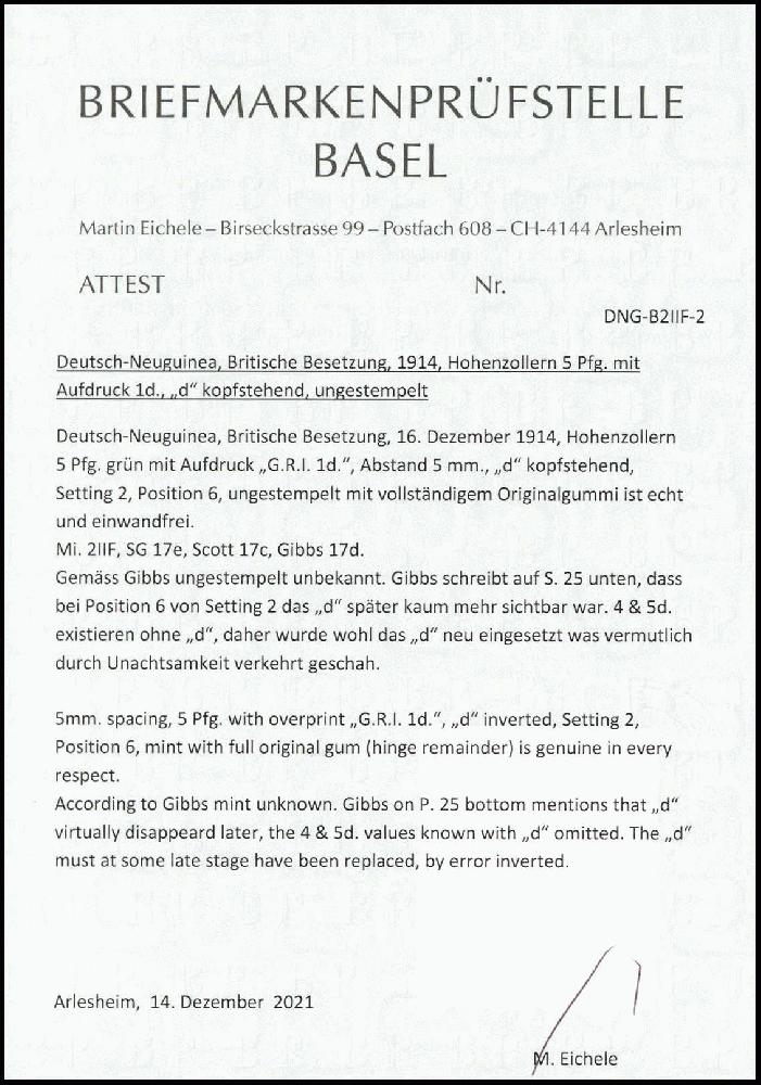 | Zusatzinformationen und Suchstichworte: | Württembergisches Auktionshaus 140. Versteigerung Auktionstermin: 18. Juni 2022 Los 6066 Deutsche Kolonien Neuguinea Britische Besetzung 1 d. a. 5 Pfg., Aufdrucktype II, Aufdruckfehler: "1 p." statt " 1 d.", tadellos ungebraucht in perfekter Zähnung und mit vollständigem Originalgummi. Eine der ganz großen Aufdruck-Raritäten der Besetzungsausgaben Neuguineas. Sowohl bei Gibbs als auch bei Stanley Gibbons in ungebrauchter Erhaltung unbekannt, bei Mi. nur mit "-,-" aufgeführt, Fotoattest Eichele (SG 17e, Gibbs 17d). Ausruf 8.000,00 EUR |