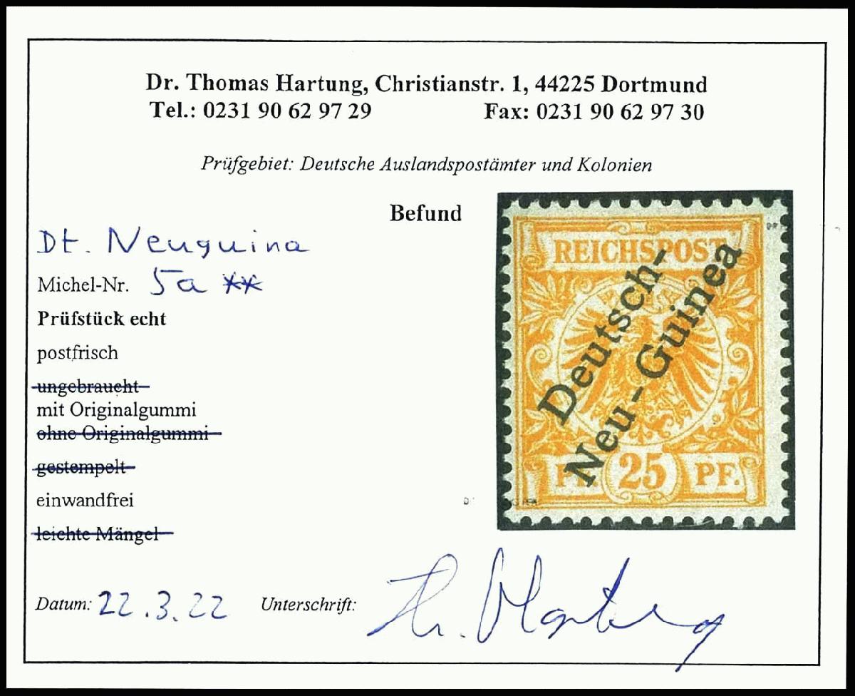 | Zusatzinformationen und Suchstichworte: | Dr. Reinhard Fischer 186. Auktion Auktionstermin: 18. - 21. Mai 2022 Los 2459 Deutsche Kolonien Neuguinea 25 Pf gelblichorange tadellos postfrisch, Fotobefund Dr. Hartung: "postfrisch, einwandfrei", Mi. 100,-- Ausruf 25,00 EUR |