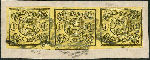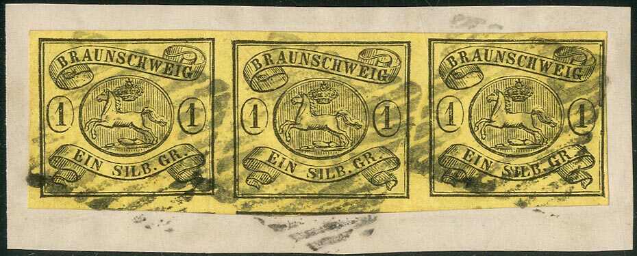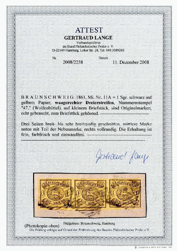 | Zusatzinformationen und Suchstichworte: | 228. Karl Pfankuch & Co Auktion Auktionstermin: 6. - 7. April 2022 Los 422 Altdeutschland Braunschweig 1 Silbergroschen schw./gelb, allseits breit- bis sehr breitrandig geschnittener waagerechter Dreierstreifen in farbfrischer und einwandfreier Erhaltung, mittlere Marke unten mit Teil der Nebenmarke, sauber mit 3 x schwarzem Nr.-Stpl."47" (Wolfenbüttel) auf Luxusbriefstück, sign. Peinelt und Fotoattest Lange. Zuschlag 315,00 EUR |
