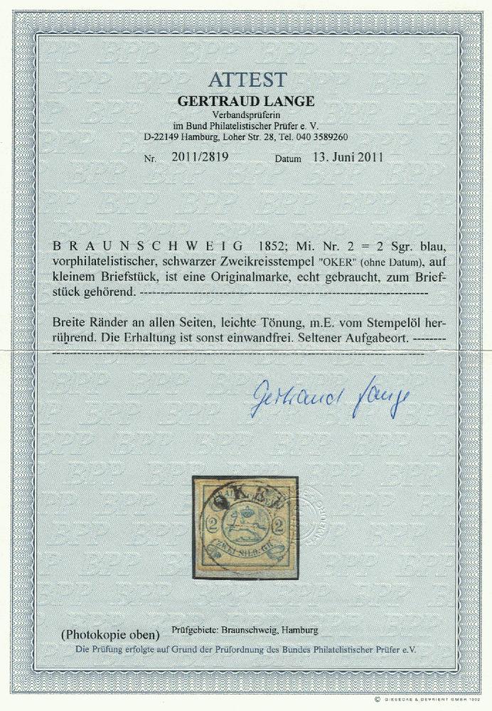 | Zusatzinformationen und Suchstichworte: | Dr. Derichs 165. Auktion Auktionstermin: 10. - 11. Juni 2022 Los 3165 Altdeutschland Braunschweig 2 Sgr. blau, vierseitig breitrandig auf Briefstück, leichte Tönung, sonst einwandfrei, mit sehr seltener Abstempelung durch zentrisch und voll aufgesetzten schwarzen Vorphila-K2 "Oker" (ohne Datum). Eine extrem seltene Abstempelung. Fotoattest Lange BPP. Zuschlag 600,00 EUR |