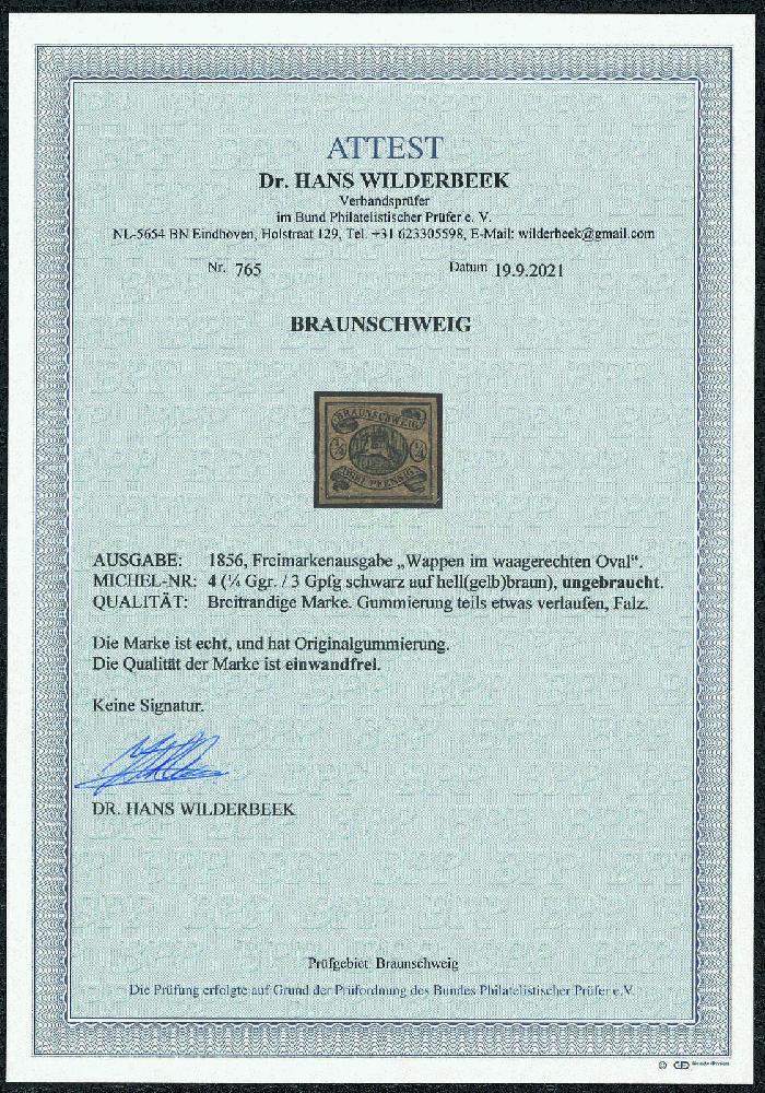 | Zusatzinformationen und Suchstichworte: | Gert Müller 114. Auktion Auktionstermin: 25. Mai 2022 Los 2789 Altdeutschland Braunschweig 1/4 Ggr./3 Gpfg. schwarz auf hellgelbbraun, wundervoll farbfrisches, allseits breitrandiges ungebrauchtes Luxusstück mit Originalgummierung. In dieser tadellosen Erhaltung sind Exemplare mit Originalgummierung fast unbekannt. Im Michel deutlich unterbewertet! Fotoattest "DIE QUALITÄT DER MARKE IST EINWANDFREI" Dr. Wilderbeek BPP. Ausruf 1.500,00 EUR |