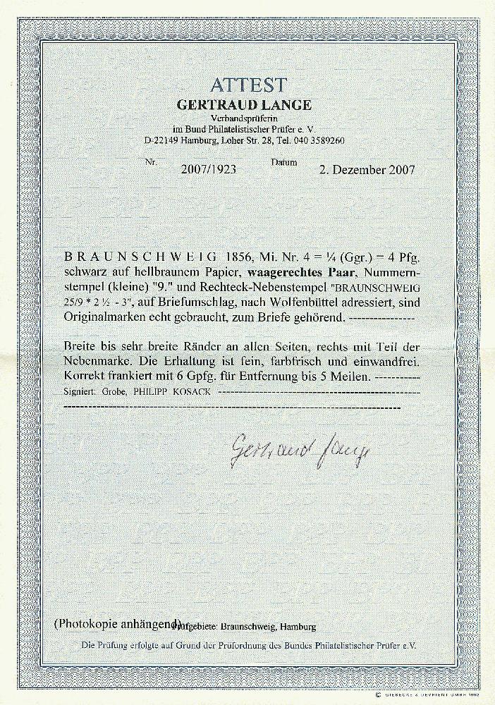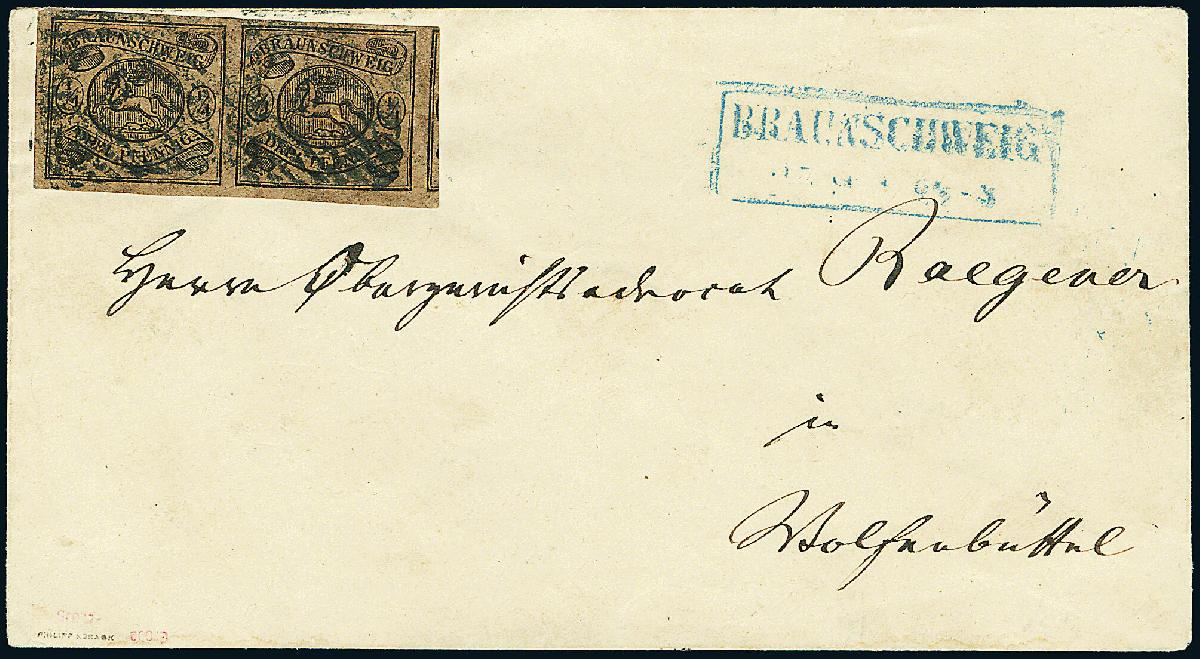 | Zusatzinformationen und Suchstichworte: | Dr. Derichs 165. Auktion Auktionstermin: 10. - 11. Juni 2022 Los 3202 Altdeutschland Braunschweig 1/4 Ggr. schw./hellbraun, waagerechtes Paar, vierseitig breitrandig bzw. rechts sogar auf voller Länge mit Teil der Nachbarmarke, auf weißem Kuvert mit schwarzen Nummernstempel "9." (kleine Ziffer) und blauem Aufgabe-Ra2 "Braunschweig 25/9" nach Wolfenbüttel. Luxus. Interessante und seltene Frankatur über 6 Gutepfennige für einen Brief im Nahbereich bis fünf Meilen. Signiert Philipp Kosack und Grobe sowie Fotoattest Lange BPP: "Die Erhaltung ist fein, farbfrisch und einwandfrei.". (Michel 2.000.-). Ausruf 600,00 EUR |