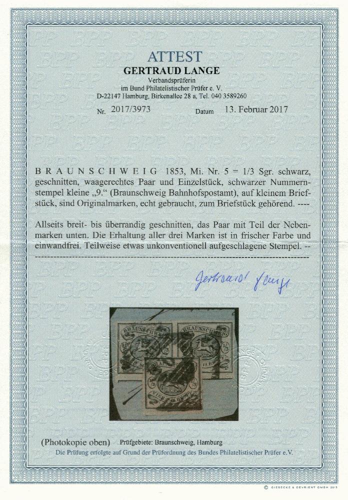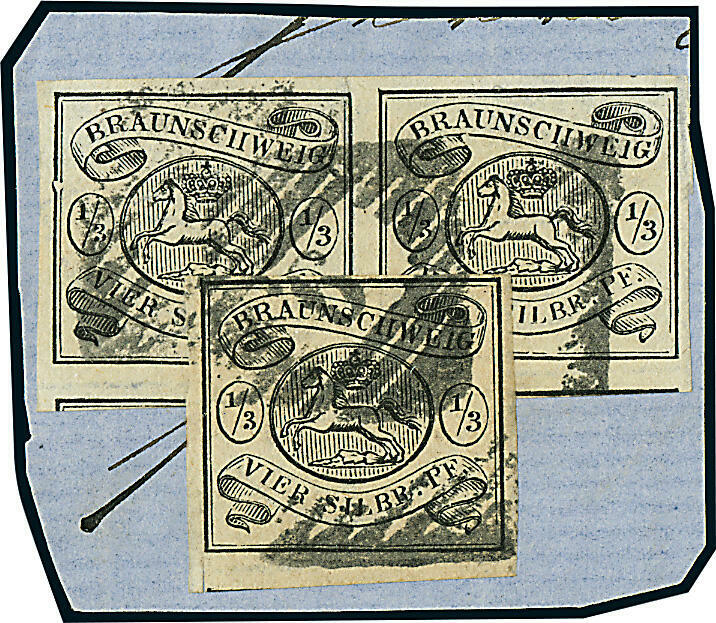 | Zusatzinformationen und Suchstichworte: | Dr. Derichs 165. Auktion Auktionstermin: 10. - 11. Juni 2022 Los 3213 Altdeutschland Braunschweig 1/3 Sgr. schw./weiß, waagerechtes Paar und Einzelmarke überlappend geklebt auf Briefstück mit Nummernstempeln "9." BRAUNSCHWEIG (kleine Ziffer), alle drei Marken voll- bis überrandig geschnitten, jeweils unten mit Teilen der Nachbarmarken. Kabinett. Fotoattest Lange BPP: "Die Erhaltung aller drei Marken ist in frischer Farbe und einwandfrei.". (Michel 1.950.-+). Ausruf 400,00 EUR |