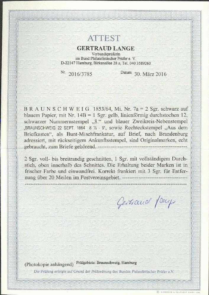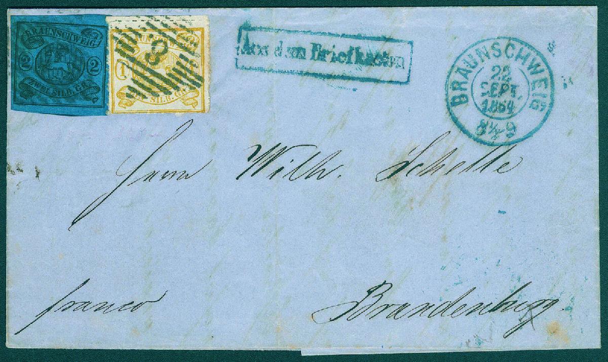 | Zusatzinformationen und Suchstichworte: | Gert Müller 114. Auktion Auktionstermin: 25. Mai 2022 Los 2792 Altdeutschland Braunschweig 2 Sgr. schwarz auf blau, farbfrisch und gut gerandet in Mischfrankatur mit 1 Sgr. gelb, linienförmig durchstochen 12 in perfekter Erhaltung auf sehr schönem Brief mit Nummernstempel "8" und beigesetztem blauem K2 "BRAUNSCHWEIG 22.SEPT.1864" sowie sehr seltenem Rahmenstempel "AUS DEM BRIEFKASTEN" nach Brandenburg. Briefe mit diesem Stempel zählen zu den großen Raritäten von Braunschweig, wobei dieser Brief durch die schöne Mischfrankatur besonders besticht. Ein phantastischer Brief für die anspruchsvolle Spezialsammlung. Luxus! Fotoattest Lange BPP. Ausruf 3.000,00 EUR |