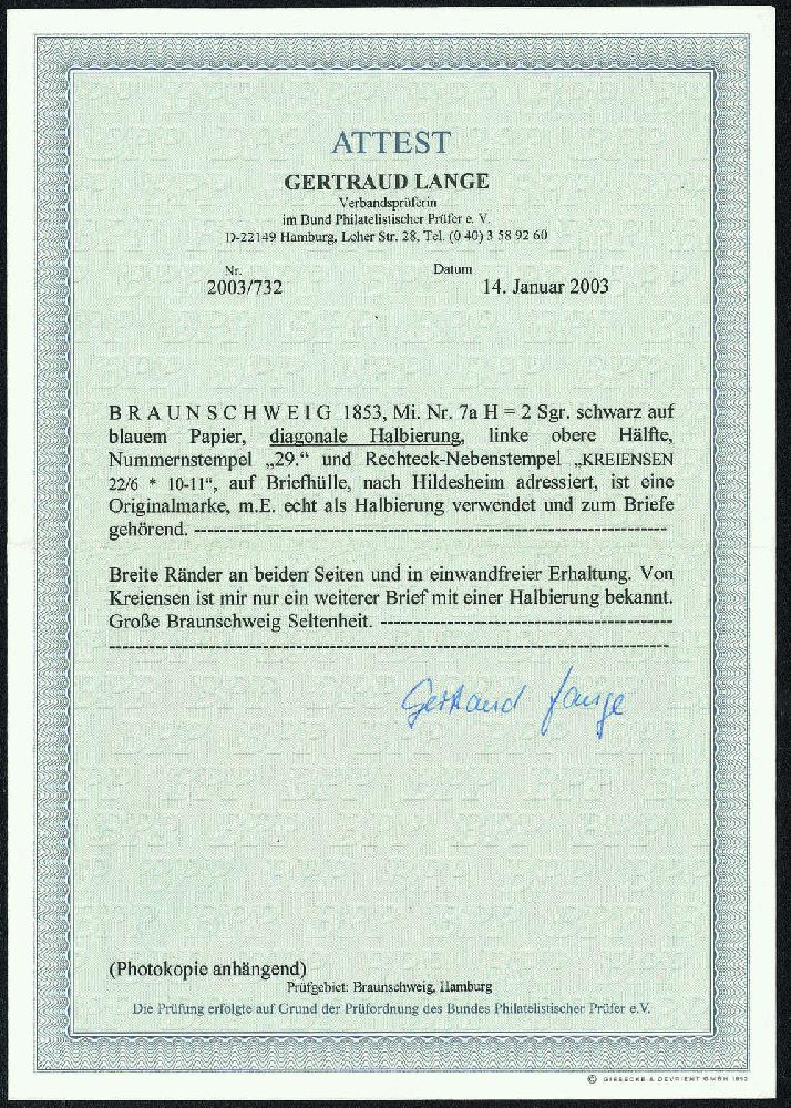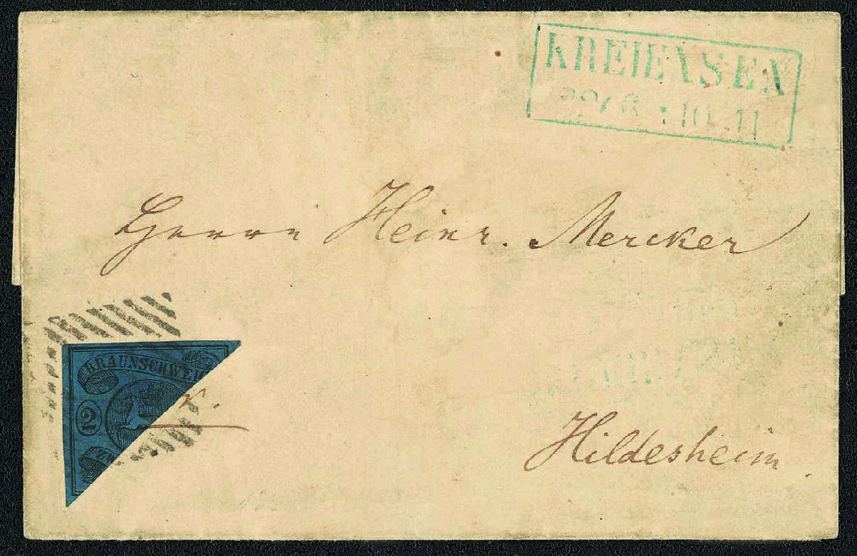 | Zusatzinformationen und Suchstichworte: | Gert Müller 114. Auktion 25. - 28. Mai 2022 Los 2793 Altdeutschland Braunschweig DAS KREIENSEN-PROVISORIUM: 2 Sgr. schwarz auf blau, diagonale Halbierung, farbfrisch und allseits breitrandig als tarifgerechte Frankatur auf kleinformatigem Brief mit Nummernstempel "29" in schwarz und beigesetztem blauem Rahmenstempel "KREIENSEN 22.6.". Von diesem Ort ist nur ein weiterer Brief mit einer Halbierung bekannt geworden. Eine der bedeutendsten Raritäten von Braunschweig! Fotoatteste Lange BPP, Dr. Wilderbeek BPP. Ausruf 8.000,00 EUR |