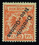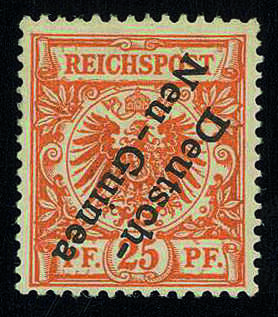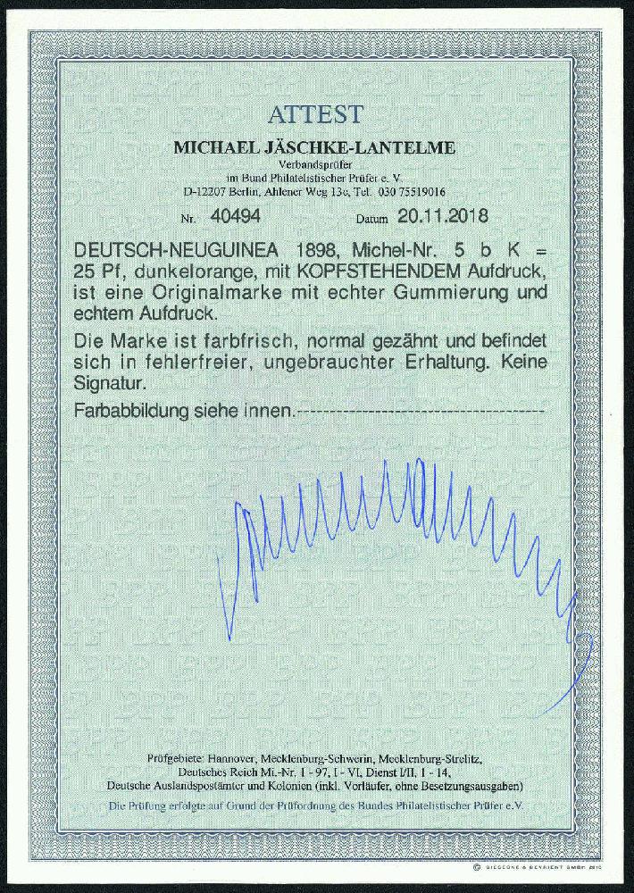 | Zusatzinformationen und Suchstichworte: | Gert Müller 114. Auktion Auktionstermin: 25. Mai 2022 Los 3052 Deutsche Kolonien Neuguinea 25 Pfg. dunkelorange, die spektakuläre Abart "KOPFSTEHENDER AUFDRUCK", farbfrisch, nahezu postfr. wirkend, tadellos ungebraucht. Es wurde nur ein Bogen zu 100 Werten dieser seltenen Abart verausgabt. Eine Seltenheit der Deutschen Kolonien! Fotoattest "FEHLERFREIE ERHALTUNG" Jäschke-Lantelme BPP. Ausruf 1.500,00 EUR |