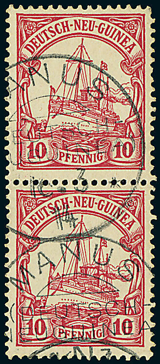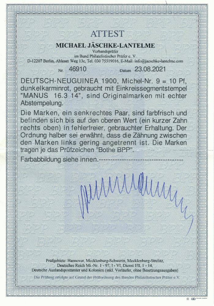 | Zusatzinformationen und Suchstichworte: | Dr. Derichs 165. Auktion Auktionstermin: 10. - 11. Juni 2022 Los 3910 Deutsche Kolonien Neuguinea "Manus (Deutsch-Neuguinea) 16.3.14", mehrfach klar abgeschlagen auf senkrechtem Paar 10 Pfg. "Kaiseryacht". Obere Marke mit leicht abgerundetem Eckzahn und links im Markenzwischenraum minim angetrennt, soweit tadellos. Ein seltener Stempel. Beide Marken tiefst geprüft Bothe BPP und neues Fotoattest Jäschke-Lantelme BPP. (ARGE für Briefstück mit nur einer Marke = 250.-). Ausruf 120,00 EUR |