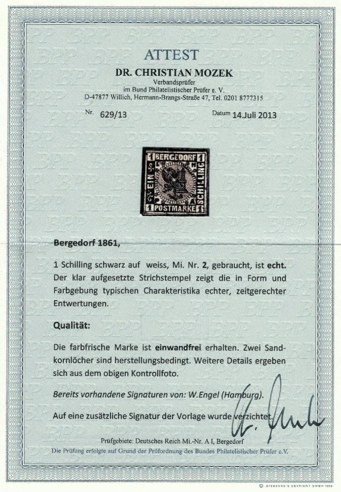 | Zusatzinformationen und Suchstichworte: | Dr. Derichs 165. Auktion Auktionstermin: 10. - 11. Juni 2022 Los 3135 Altdeutschland Bergedorf 1 Sch. schw./weiß, vierseitig breitrandig und in frischer Farbe mit schön aufgesetztem Strichstempel. Luxus. In dieser völlig einwandfreien Qualität sind gestempelte Bergedorf-Marken praktisch kaum zu finden und fehlen deshalb in fast allen Altdeutschland-Sammlungen. Geprüft Walter Engel und Fotoattest Dr. Mozek BPP: "Die farbfrische Marke ist einwandfrei erhalten. Zwei Sandkornlöcher sind herstellungsbedingt.". Zuschlag 600,00 EUR |