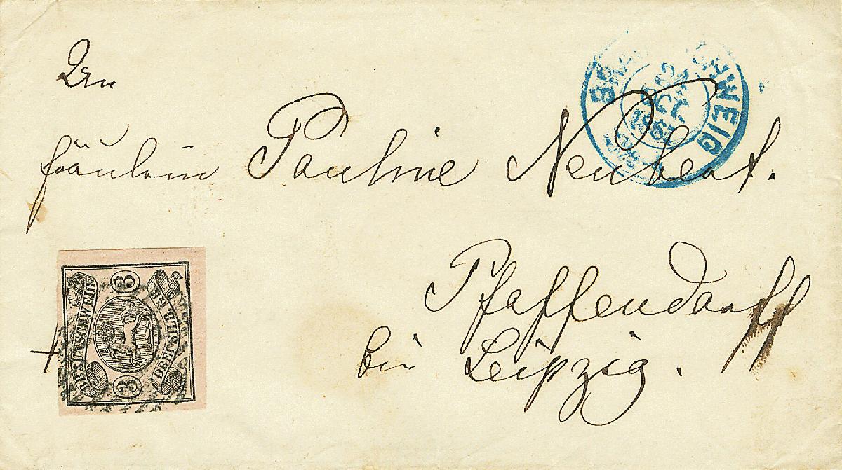 | Zusatzinformationen und Suchstichworte: | Dr. Derichs 165. Auktion Auktionstermin: 10. - 11. Juni 2022 Los 3254 Altdeutschland Braunschweig 3 Sgr. schw./lebhaftrosa, gute "b"-Farbe, vierseitig breitrandig auf kleinem Kuvert mit schwarzem Nummernstempel "8." und blauem Aufgabe-K2 "Braunschweig 24 Oct.1864" nach Pfaffendorff bei Leipzig/Königreich Sachsen. Kabinett. Fotoattest Lange BPP: "Breite Ränder an allen Seiten und in farbfrischer, einwandfreier Erhaltung.". (Michel 700.-). Zuschlag 150,00 EUR |