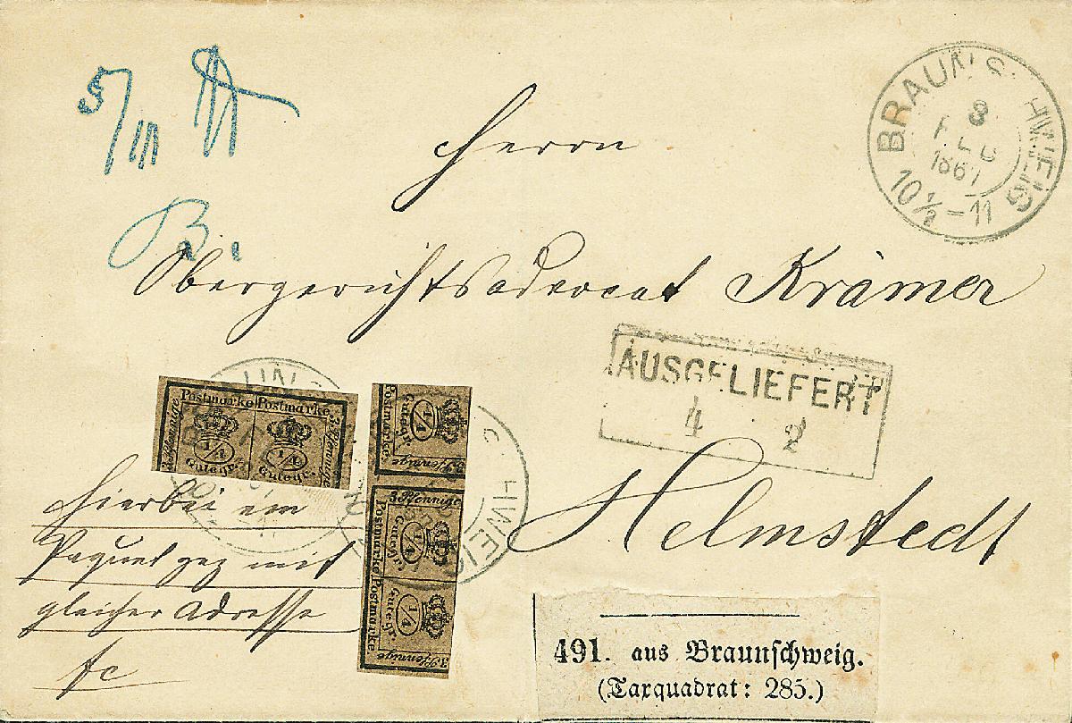| Zusatzinformationen und Suchstichworte: | Dr. Derichs 165. Auktion Auktionstermin: 10. - 11. Juni 2022 Los 3269 Altdeutschland Braunschweig 2/4 Ggr. schw./braun und 3/4 Ggr. schw./braun, zwei perfekt geschnittene Einheiten auf Paketbegleitbrief mit schwarzen K2 "Braunschweig 3 Feb.1867" (Type mit breiten Buchstaben, ab Mitte September 1863 hauptsächlich bei der Fahrpost im Einsatz) auf den Marken und rechts oben in der Ecke des Briefes nochmals beigesetzt, nach Helmstedt gelaufen mit vorderseitigem Ra2 "Ausgeliefert 4/2" sowie mit vorderseitigem Aufkleber "491. aus Braunschweig (Taxquadrat: 285.)". Luxus. Fotoattest Lange BPP: "in feiner, farbfrischer und einwandfreier Erhaltung". Zuschlag 500,00 EUR |