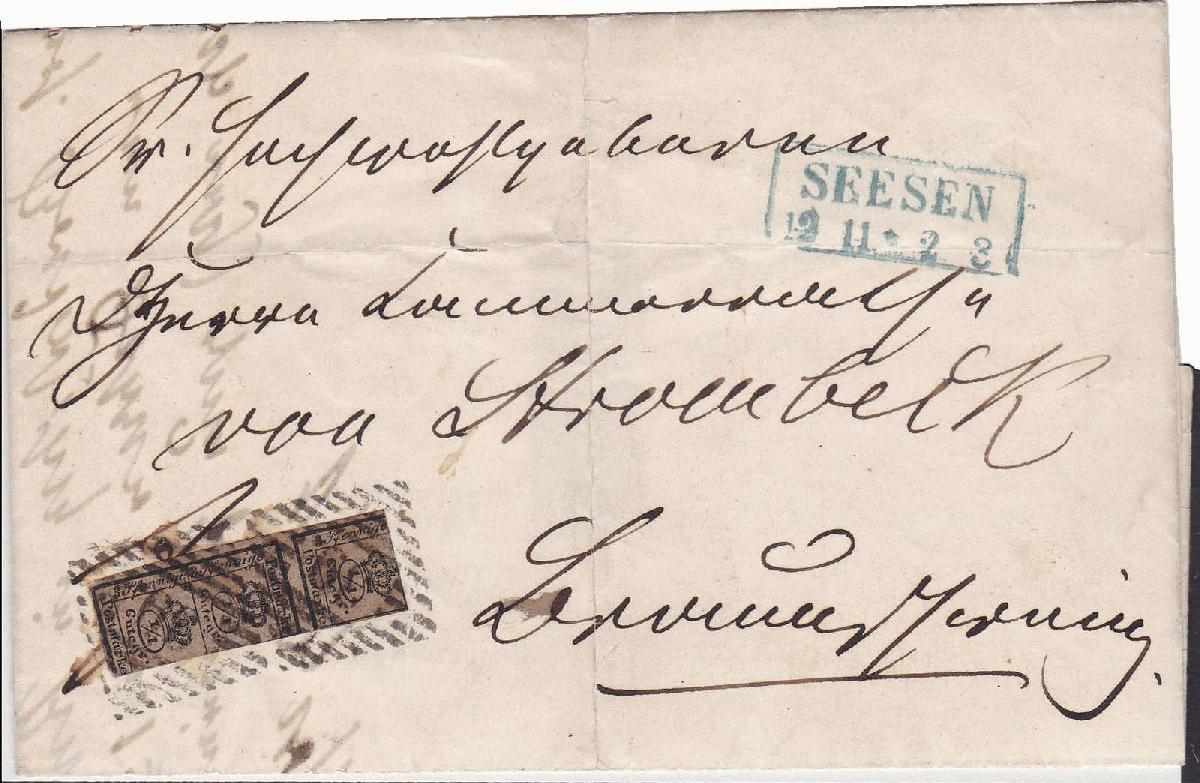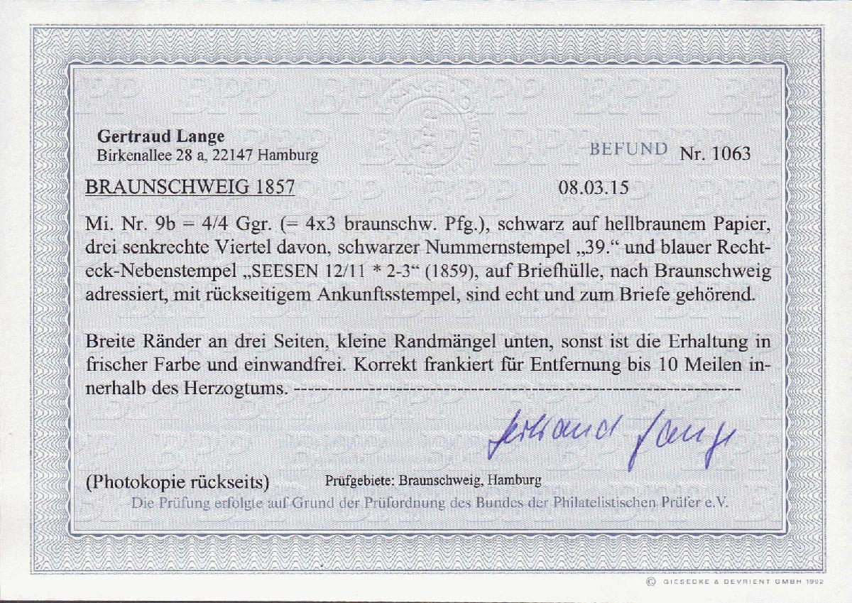 | Zusatzinformationen und Suchstichworte: | 200. Auktionshaus Schulz Auktion Auktionstermin: 18. - 19. Juli 2022 Los 2584 Altdeutschland Braunschweig 3/4 Ggr. schwarz auf gelbbraun auf weißem Brief mit perfektem Nr.-Stempel "39" neben blauem Ra2 "Seesen 12/11" nach Braunschweig, portogerecht, ausführlicher FFB Lange BPP Ausruf 200,00 EUR |