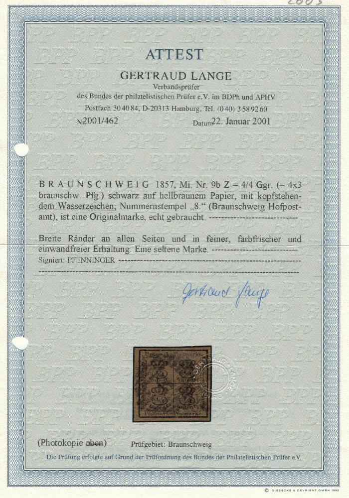 | Zusatzinformationen und Suchstichworte: | Dr. Derichs 165. Auktion Auktionstermin: 10. - 11. Juni 2022 Los 3272 Altdeutschland Braunschweig \KOPFSTEHENDES WASSERZEICHEN\: 4/4 Ggr. schw./gelbbraun, Abart "kopfstehendes Wasserzeichen", vierseitig breitrandig, in frischer Farbe und mit zentrischem Nummernstempel "8" BRAUNSCHWEIG. Luxus. Tiefst geprüft Pfenninger und Fotoattest Lange BPP: "Breite Ränder an allen Seiten und in feiner, farbfrischer und einwandfreier Erhaltung. Eine seltene Marke.". (Michel 2.600.-). Zuschlag 600,00 EUR |