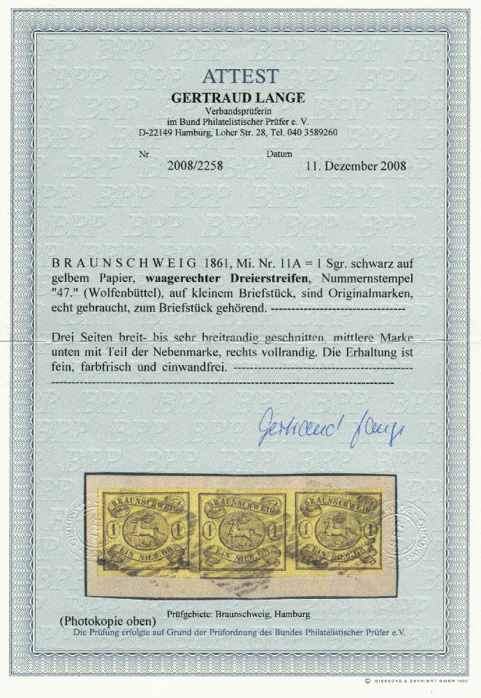 | Zusatzinformationen und Suchstichworte: | Dr. Derichs 165. Auktion Auktionstermin: 10. - 11. Juni 2022 Los 3288 Altdeutschland Braunschweig 1 Sgr. schw./gelb, waagerechter Dreierstreifen, vierseitig voll- bis breitrandig bzw. die beiden linken Marken unten sogar mit Ansätzen der beiden Nachbarmarken, auf Briefstück mit Nummernstempeln "47." WOLFENBÜTTEL. Luxus. Eine seltene Streifen-Einheit, insbesondere in dieser absolut perfekten Qualität. Fotoattest Lange BPP: "Die Erhaltung ist fein, farbfrisch und einwandfrei.". (Michel 1.500.-+). Ausruf 450,00 EUR |