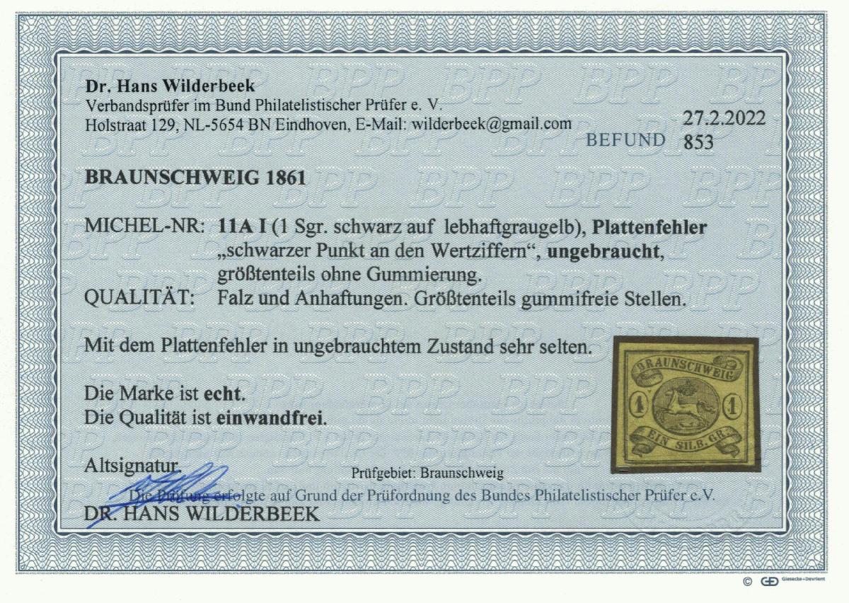 | Zusatzinformationen und Suchstichworte: | Dr. Derichs 165. Auktion Auktionstermin: 10. - 11. Juni 2022 Los 3291 Altdeutschland Braunschweig 1 Sgr. schw./lebhaftgraugelb, Plattenfehler "I" = "schwarzer Punkt rechts an der linken und links an der rechten Wertziffer, Rahmenlinien links unten gebogen", ungebraucht mit Teilen der originalen Gummierung, größtenteils aber ohne Gummierung, vierseitig voll- bis breitrandig. Luxus. Neuer Fotobefund Dr. Wilderbeek BPP: "Mit dem Plattenfehler in ungebrauchtem Zustand sehr selten. Die Marke ist echt. Die Qualität ist einwandfrei.". (Im Michel ungebraucht auf Grund der Seltenheit nur mit "-.-" verzeichnet). Zuschlag 740,00 EUR |