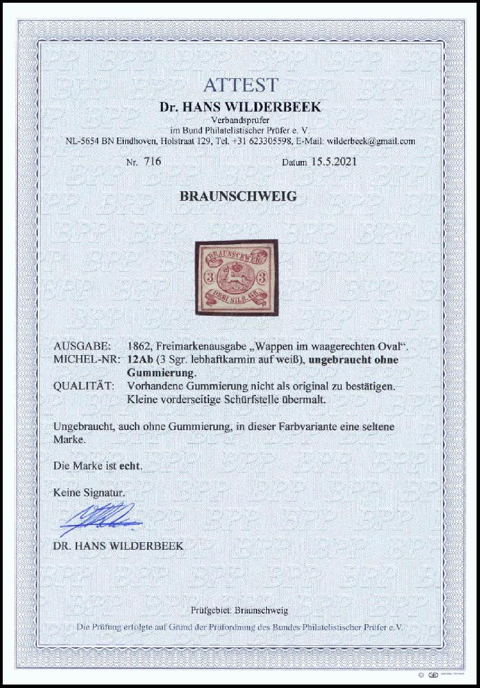 | Zusatzinformationen und Suchstichworte: | Württembergisches Auktionshaus 140. Versteigerung Auktionstermin: 17. - 18. Juni 2022 Los 2299 Altdeutschland Braunschweig 3 Sgr. lebhaftkarmin, ungebraucht, hervorragend farbfrisches Exemplar o.G. (winz. überdeckte Schürfstelle). In ungebrauchter Erhaltung sind von dieser Marke nur ganz wenige Exemplare erhalten geblieben, bei Mi. nur mit "-,-" notiert, Fotoattest Wilderbeek BPP. Ausruf 500,00 EUR |