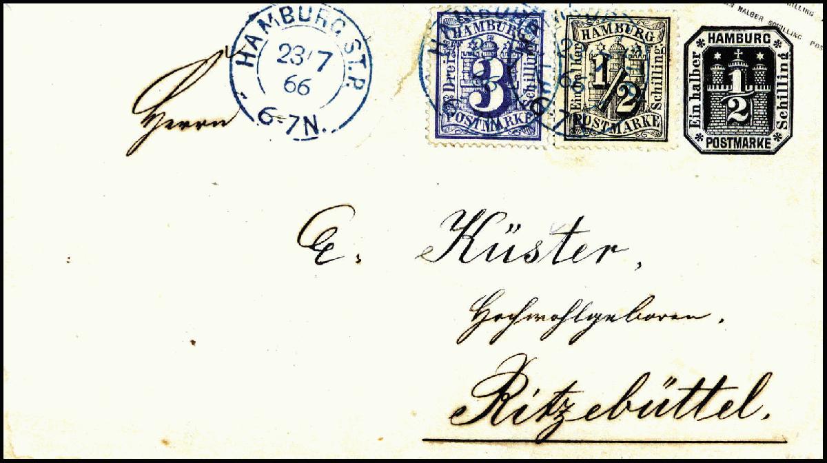 | Zusatzinformationen und Suchstichworte: | Württembergisches Auktionshaus 140. Versteigerung Auktionstermin: 17. - 18. Juni 2022 Los 2340 Altdeutschland Hamburg½ Sch. mit 3 Sch. ultramarin als Zusatzfrankatur auf Ganzsachenkuvert ½ Sch. schwarz mit sauber aufges. blauen K2 HAMBURG ST.P. 23/7 66 nach Ritzebüttel mit rs. Ak.-Stempel. Umschlag sauber ausgebessert. Eine einmalige Marken-Ganzsachen-Kombination für einen Brief in der 2.Gewichtsstufe von Hamburg nach Ritzebüttel, Fotoattest Mehlmann BPP. Ausruf 1.200,00 EUR |