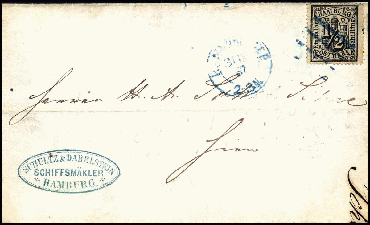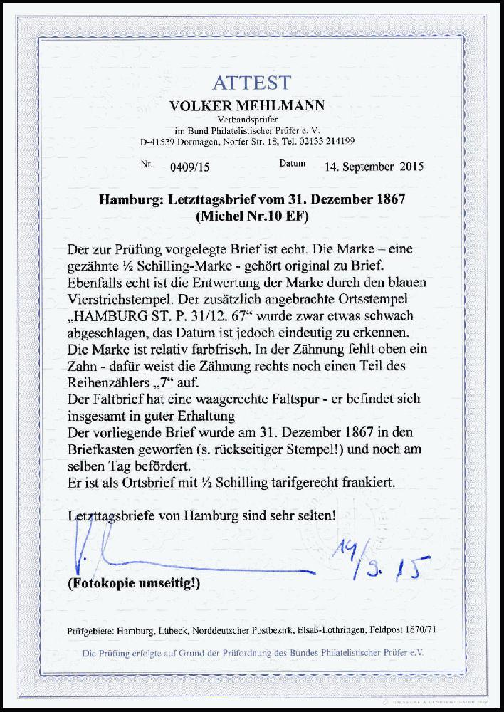 | Zusatzinformationen und Suchstichworte: | Württembergisches Auktionshaus 140. Versteigerung Auktionstermin: 17. - 18. Juni 2022 Los 2337 Altdeutschland Hamburg Letzttagsbrief: ½ Sch., re. mit Teil des Reihenzählers "7" als Einzelfrankatur (oben 1 Z.) auf Orts-Faltbrief mit blauem Strichstempel und Aufgabe-K2 HAMBURG ST.P. 31/12 67. Einer der ganz wenigen erhalten gebliebenen Letzttagsbriefe Hamburgs, Fotoattest Mehlmann BPP ("Letzttagsbriefe von Hamburg sind sehr selten!"). Ausruf 300,00 EUR |