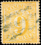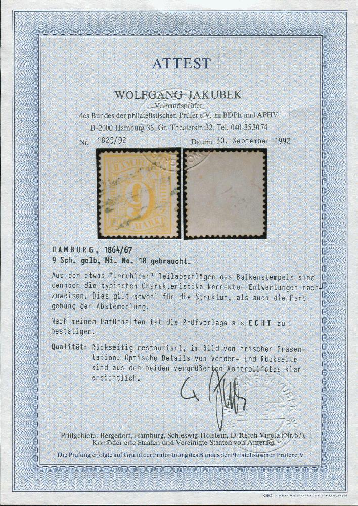 | Zusatzinformationen und Suchstichworte: | 30. Schlegel Auktionshaus Auktion Auktionstermin: 25. - 27. April 2022 Los 2647 Altdeutschland Hamburg 1864, 9 S. orangegelb gestempelt, farbfrisch, etwas unruhiger Stempelabschlag, rückseitig repariert, Fotoattest Jakubek BPP (ME 2.600,-) Zuschlag 290,00 EUR |