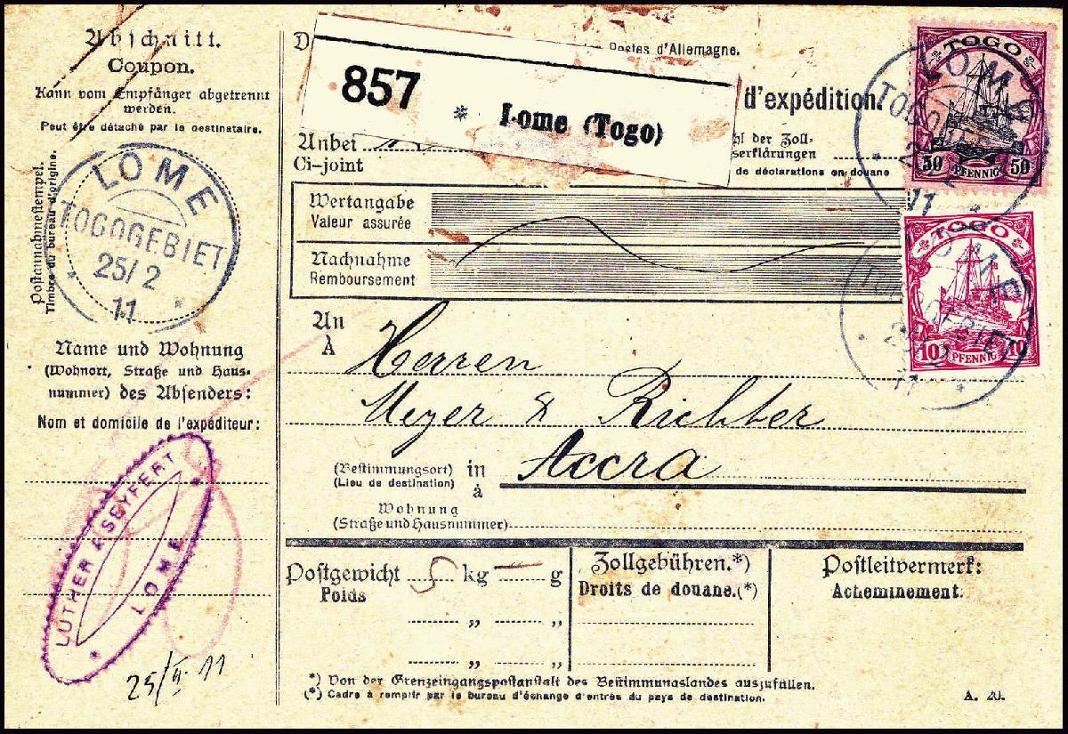 | Zusatzinformationen und Suchstichworte: | Württembergisches Auktionshaus 140. Versteigerung Auktionstermin: 18. Juni 2022 Los 7777 + Deutsche Kolonien Togo Innerafrika-Paketkarte: 10 Pfg. mit 50 Pfg. auf vollständiger Paketkarte mit Coupon für ein Paket im Gewicht von 5 kg nach Accra/Goldküste. Sauber aufges. Stempel LOME TOGOGEBIET 25/2 11. Bis auf eine kl. Knitterspur bei der 50 Pfg. in tadelloser Erhaltung. Praktisch alle bekannten Togo-Paketkarten sind nach Dtld. adressiert, Inlandskarten sind fast unbekannt, Fotoattest Steuer BPP. Ausruf 1.400,00 EUR |