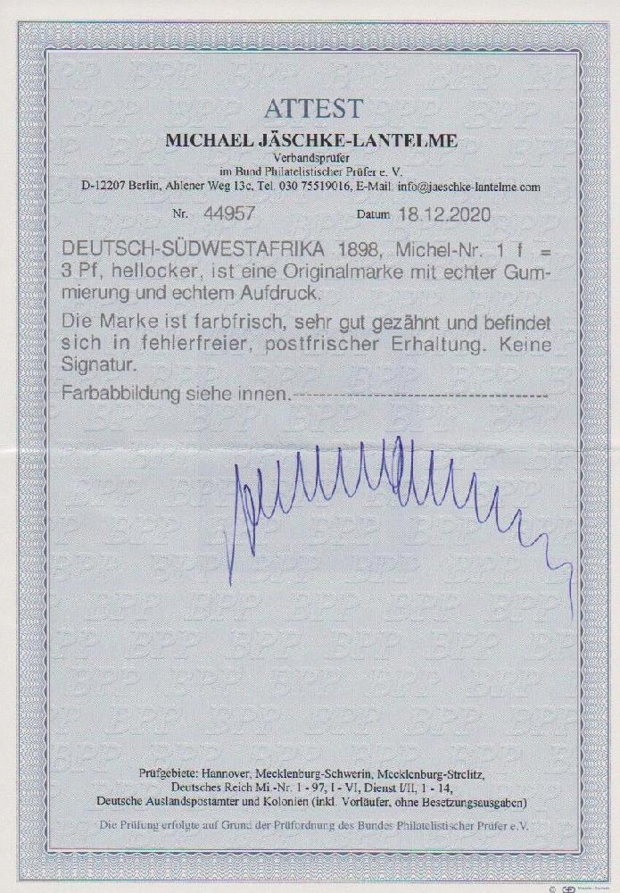 | Zusatzinformationen und Suchstichworte: | Rauhut & Kruschel - 212. Auktion Auktionstermin: 30. Juli 2022 Los 3315 Deutsche Kolonien Südwestafrika, Vorläufer 3 Pfg. hellocker tadellos postfrisch, seltene Farbe, Attest Jäschke-L. Mi. 900,- Ausruf 300,00 EUR |