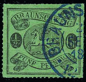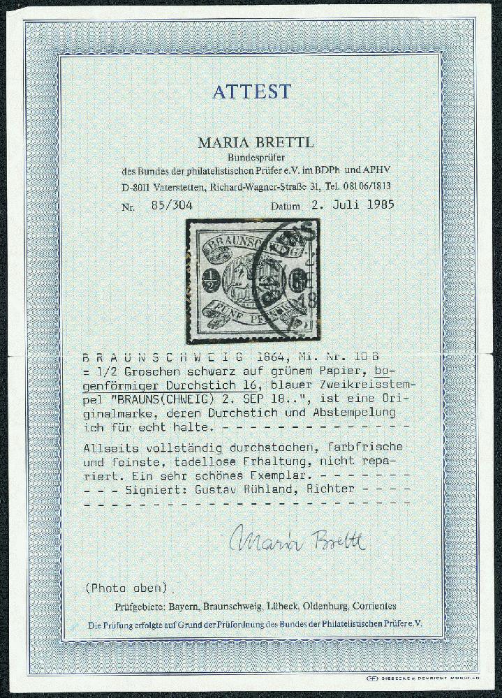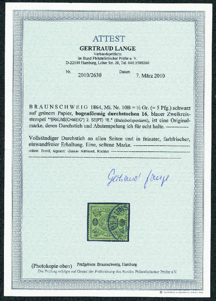 | Zusatzinformationen und Suchstichworte: | Gert Müller 114. Auktion Auktionstermin: 25. Mai 2022 Los 2794 Altdeutschland Braunschweig 1/2 Gr./5 Pfg. schwarz auf grün mit seltenem bogenförmigem Durchstich 16, farbfrisch mit allseits perfektem Durchstich und klarem blauem K2 "BRAUNSCHWEIG". Ein Luxusstück dieser kaum einmal angebotenen Ausgabe! Fotoattest "TADELLOSE ERHALTUNG" Brettl und Fotoattest "EINWANDFREIE ERHALTUNG" Lange BPP. Ausruf 2.000,00 EUR |