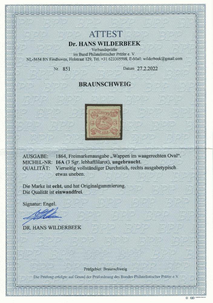 | Zusatzinformationen und Suchstichworte: | Dr. Derichs 165. Auktion Auktionstermin: 10. - 11. Juni 2022 Los 3321 Altdeutschland Braunschweig 3 Sgr. lebhaftlilarot, bogenförmig durchstochen, ungebraucht mit originaler Gummierung. Sehr gut, rechts ausgabetypisch durchstochen, einwandfrei. Kabinett. Eine ungebraucht seltene Marke. Neues Fotoattest Dr. Wilderbeek BPP: "Die Qualität ist einwandfrei.". (Michel 1.000.-). Zuschlag 300,00 EUR |
