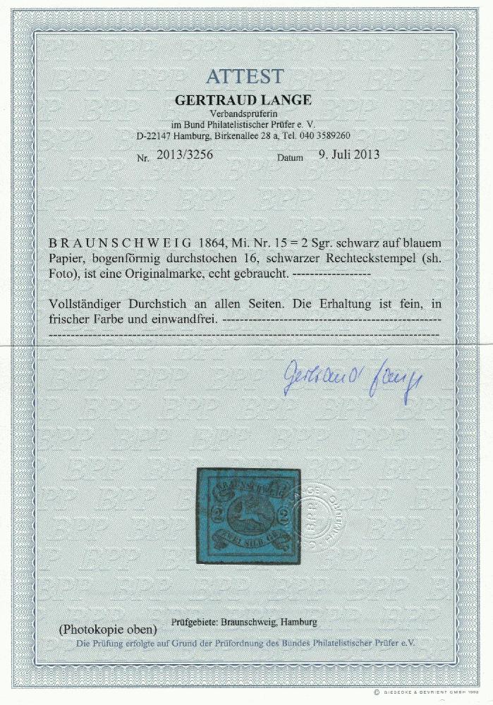 | Zusatzinformationen und Suchstichworte: | Dr. Derichs 165. Auktion Auktionstermin: 10. - 11. Juni 2022 Los 3319 Altdeutschland Braunschweig 2 Sgr. schw./blau, bogenförmig durchstochen, gestempeltes Luxusstück. Fotoattest Lange BPP: "Die Erhaltung ist fein, in frischer Farbe und einwandfrei.". (Michel 420.-). Zuschlag 120,00 EUR |