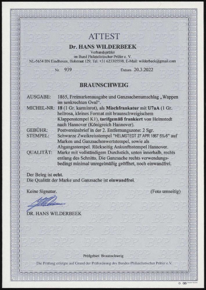 | Zusatzinformationen und Suchstichworte: | 79. HBA Auktion Auktionstermin: 12. - 14. Mai 2022 Los 1034 Altdeutschland Braunschweig 1865, Wappen, 1 Gr., karminrot, allseits sehr gut durchstochen, als Zusatzfrankatur auf Ganzsachen-Umschlag 1 Gr., hellrosa, als portogerechte Frankatur von "HELMSTEDT 27 APR 1867" nach Hannover mit Ankunftsstempel, der Umschlag rechts oben mit winzigem Öffnungsmangel, sonst tadellose Kabinetterhaltung, gepr. Dr. Wilderbeek mit neuem Fotoattest. Zuschlag 150,00 EUR |