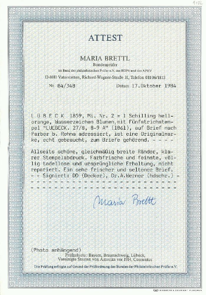 | Zusatzinformationen und Suchstichworte: | Rapp Auktion 2022 Auktionstermin: 2. - 7. Mai 2022 Los 946 Altdeutschland Lübeck 1 Sch. hellorange, in leuchtend frischen Farben, gleichmässig breite Ränder und sehr sauberem Strichstempel, daneben grosser Aufgabestempel LUEBECK 27/8 (1861) auf vollständigem Brief nach Parber bei Rehna. Laut Attest Brettl "feinste und völlig tadellose ursprüngliche Erhaltung". Zuschlag 3.000,00 CHF |