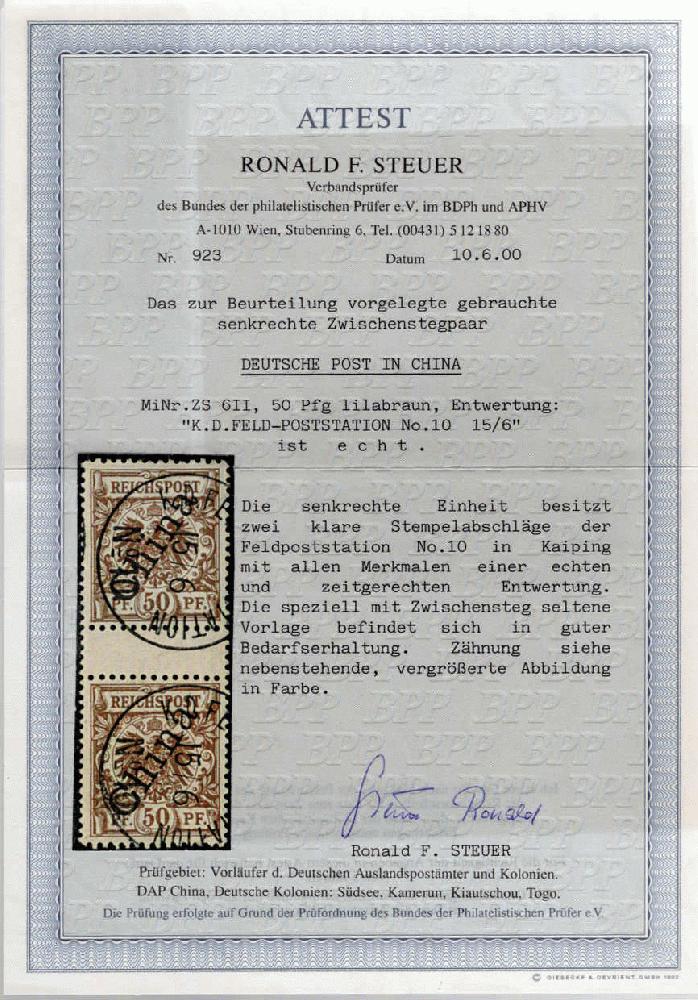 | Zusatzinformationen und Suchstichworte: | 73. AAK Phila GmbH Auktion Auktionstermin: 7. Mai 2022 Los 4296 (D) Deutsche Auslandspost China 50 Pf lilabraun im senkr. Zwischenstegpaar m. seltener Entwertung aus Kaiping K.D. FPS No. 10 m. FA Steuer BPP "echt, seltene Vorlage, gute Bedarfserhaltung", seltene Kombination Stempel u. Zwischenstegpaar! Ausruf 200,00 EUR |